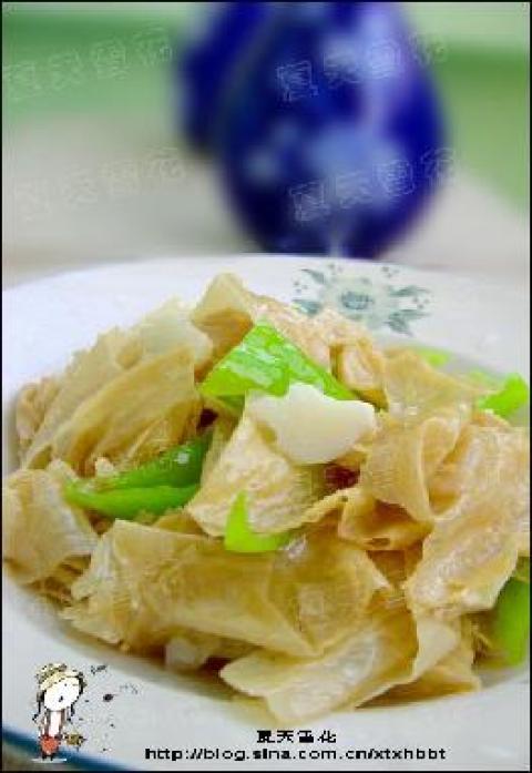 豆皮两块,尖椒一个,盐少许,花生油少许,大蒜少许,鸡精少许
