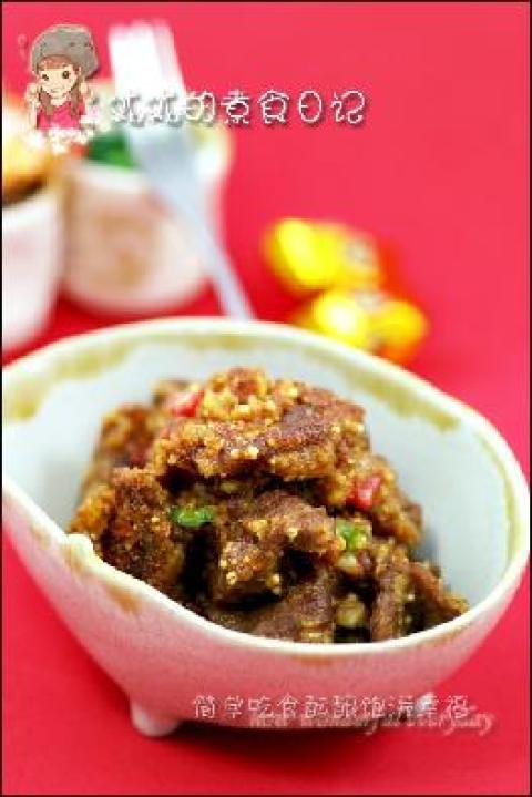 1.以豆瓣酱,酱油,酒,姜末,香油等将牛肉腌渍,再拌上五香炒米粉;