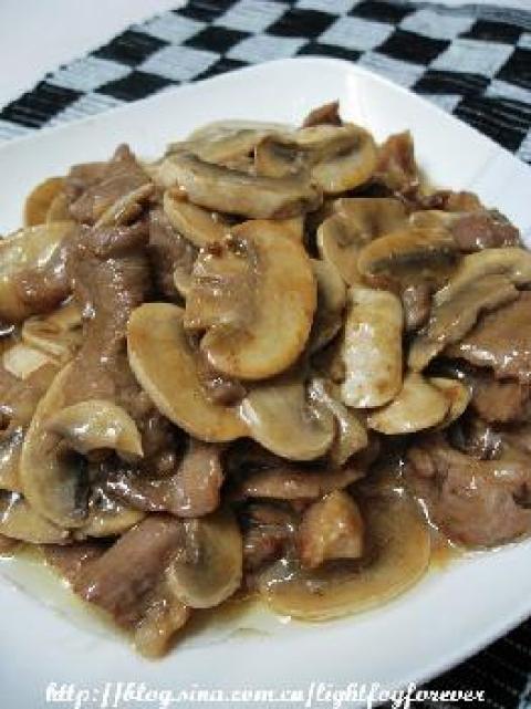 4.下油把姜片爆香,倒入猪肉片,快速滑开至变色,加入蘑菇,继续翻炒1分钟,倒入一点点鲍汁调味,生粉兑点水勾个薄芡即可上碟。