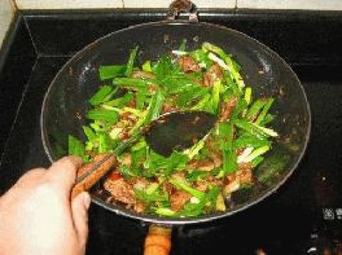 7.放入蒜苗,再加火小炒一下。注意,不要把蒜苗炒死了,炒生点更香!