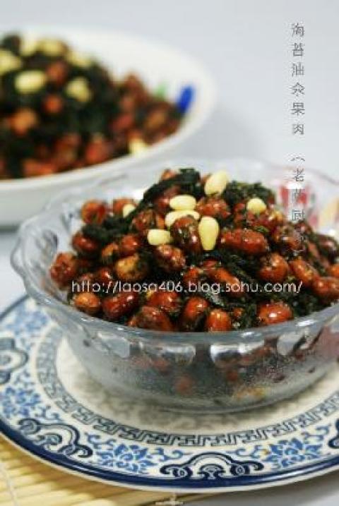 3.将凉好的花生米和海苔放在一起,加点白糖和松仁(不放也行)拌匀即可。