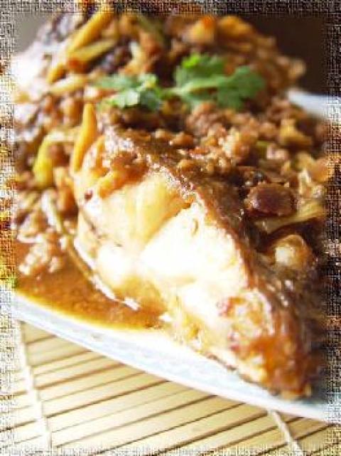 3.锅内留少许油,下葱、姜、蒜末和辣椒酱爆出香味后,将肉糜下锅一起煸炒,烹入黄酒,加酱油、糖、味精,用水淀粉勾芡后淋在鱼尾上即成。