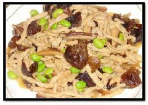 1.水面筋(丝)用水煮过洗去酸味,与香菇丝、毛豆等一同翻炒勾芡。