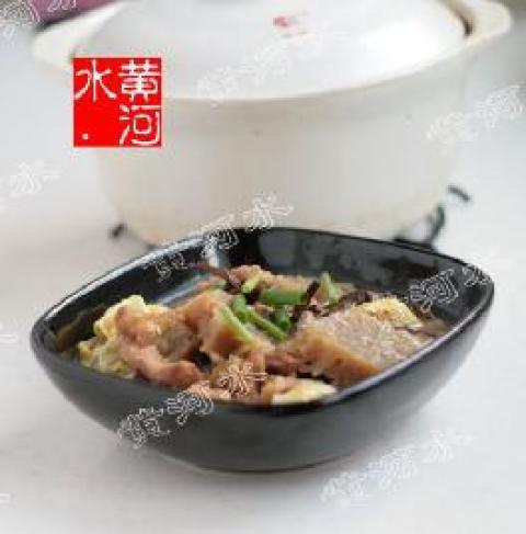 10.砂锅中加高汤、放葱、姜、炸好的小酥肉、焖子、盐、料酒、酱油,大火烧沸,改小火炖30分钟,放入蘑菇、白菜