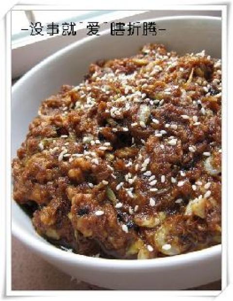 5.熬制成肉酱后,最后下已炒好的芝麻增香即可。