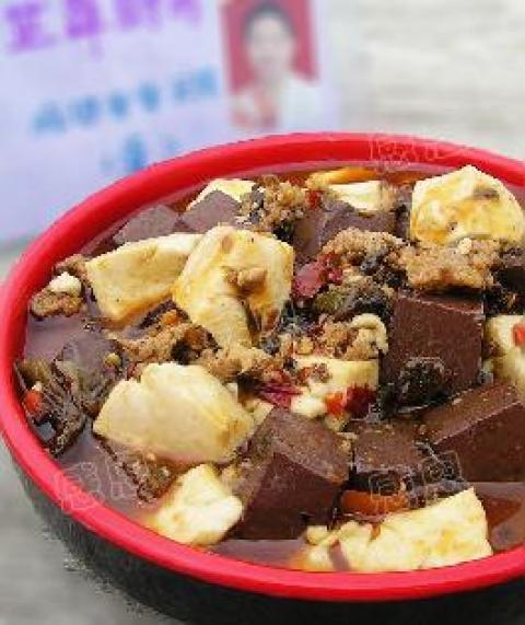 嫩豆腐,血豆腐,川冬菜,猪肉末,淀粉,豆瓣酱,白糖,蚝油,酱油,芝麻油
