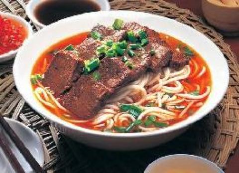 (3)将粉丝和拉面煮熟,取牛肉汤,配以青菜心、香菜、葱花即可上桌