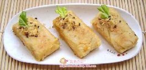 鸡肉200克,猪肉100克,松子仁80克,香油500克,淀粉70克,黄酒5克,鸡汤半碗,豆腐皮l卷,盐、味精各适量。
