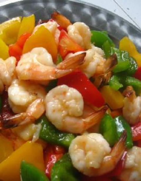 明虾,彩椒,生粉,蛋清,盐,味精,糖,麻油
