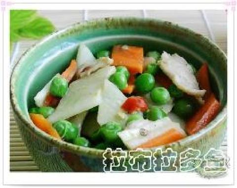 凉薯,里脊肉片,豌豆粒,胡萝卜,剁椒(不吃辣可以省略)