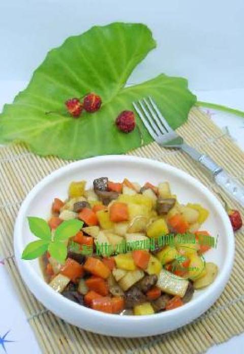 3)热锅倒油,加入姜片和灯笼椒爆香,后加入牛肉滑散后加入山药、胡萝卜丁,翻炒均匀后,调入少许酱油,炒30秒后加入菠萝丁翻炒均匀,调入适量的盐和白糖即可出锅。 注:菠萝去皮后提前用淡盐水侵泡,山药含有淀粉,所以在炒制过程中,不用调入水淀粉,如炒制过程中,锅中水份不够,可调入适量开水,以免干锅。