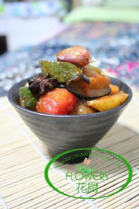 1、热锅倒油,加入大料和大蒜爆香后,加入土豆和茄子煸炒至七成熟后加入黄瓜、西红柿和青椒,调入韩式辣椒酱炒加放少许开水均后,炖十分钟左右;