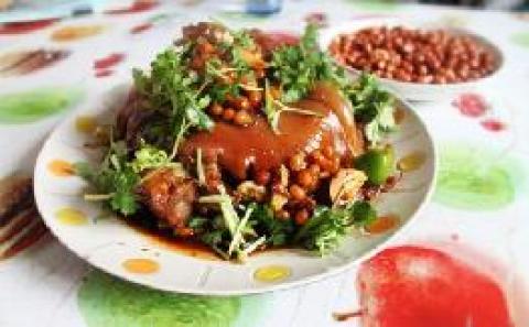4.4、汤收到浓稠,将肘子称出来放盘子上,浇上锅底的汁儿,撒上焖熟的黄豆,撒上香菜。