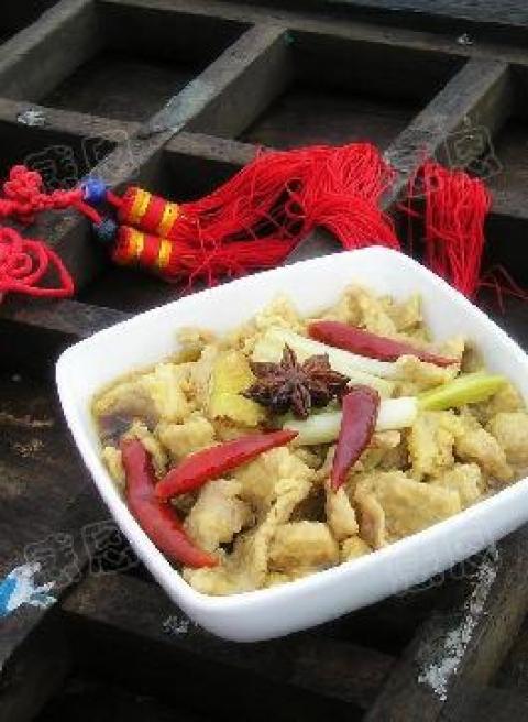 3.8.肉片炸好后捞出沥油备用。9.准备葱、姜片、花椒、大茴和干红辣椒,不喜欢辣的可以省略辣椒。10.取一只碗,放入半碗水,高汤更好。11.碗内加入老抽。