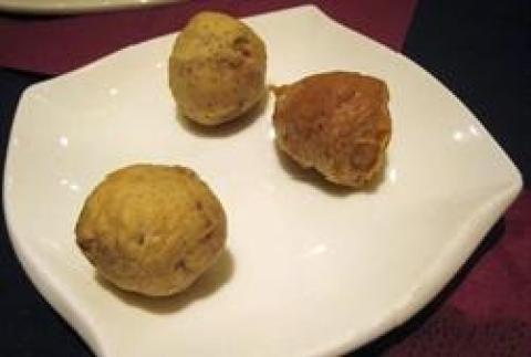 (3)把每个肉丸表面以面煳沾裹后,再放入八分热的油锅中炸,沾裹时要均匀,油炸时肉馅才不会流出。