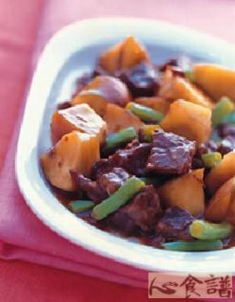 (3)热油锅后,放入四季豆略炒,再倒入整罐红烧牛肉罐头(含汁)以及水1/2杯,用中火煮沸,再加入苹果丁煮1分钟后,再倒入太白粉水芶芡,煮至浓淍状,即可熄火盛起放入盘中。