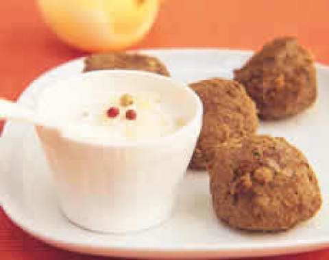 (5)把牛肉球放置盘中,淋上优格沙拉酱即可。