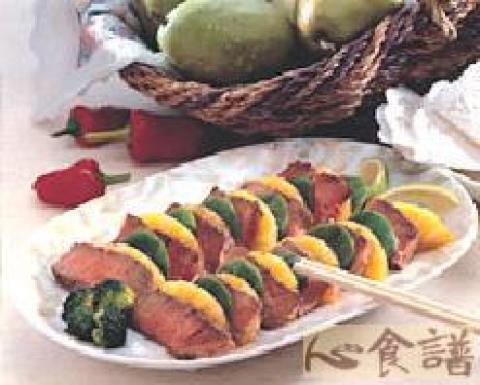 (3)取一片牛肉、一片凤梨、一片青椒,相互间隔排盘如麒麟状,食用时淋上柠檬汁即成。