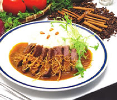 纽西兰冷藏板腱600公克,奶油150公克,洋葱2颗,红萝卜200公克,马铃薯100公克,大蒜30公克,红葡萄酒50㏄,玉桂叶3片,巧克力粉3茶匙,肉桂粉1/2茶匙,荳蔻粉1/4茶匙,盐2茶匙,糖5茶匙,麦芽糖50公克,优格30公克,乌斯特酱油20㏄,干葱丝少许,绿色蔬菜1朵