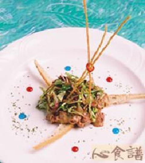 4.牛菲力做底,将作法3拌好的生菜置于上方,最后再用炸过的义大利面装饰即完成。