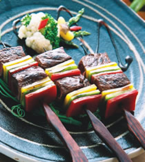 5.用烤肉叉交互串上作法3和4的材料,刷上烤肉酱,烤至略干,取出再重覆刷烤肉酱2次入味即可。