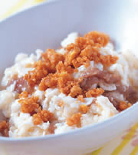 2.取一炒菜锅,放入沙拉油于锅内热锅后,再放入韩式辣酱、白饭以小火拌炒均匀后,盛入拌饭碗内。