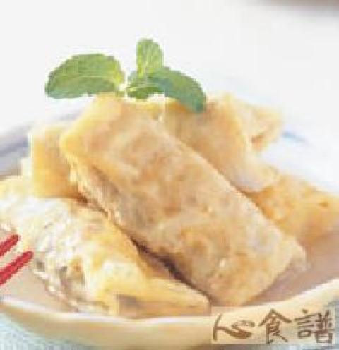 3.用作法1的蛋皮将作法2的馅料包成卷,放入蒸笼以小火蒸6分钟取出。