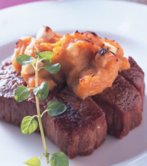 5.作法1的沙朗牛肉块放上烤炉烤约七分熟后,将作法4的味噌涂酱均匀涂上,再放入烤箱以180℃烧烤至上色即可。