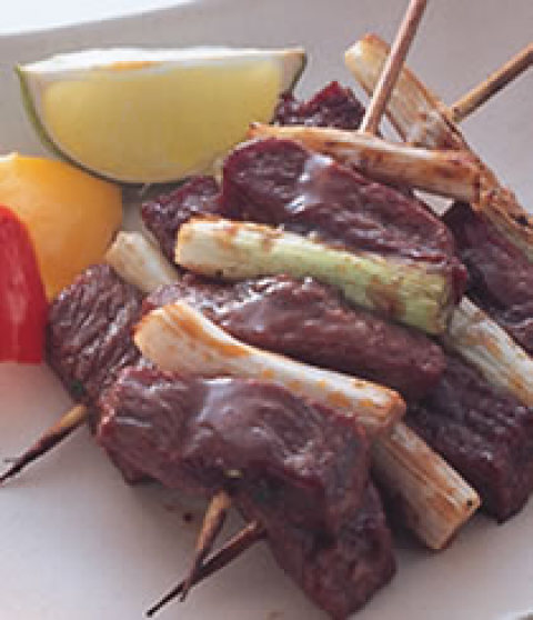 3.将作法2的牛肉块与作法1的青葱段用竹签串起,放入已预热的烤箱中,以180℃烤10分钟即可。