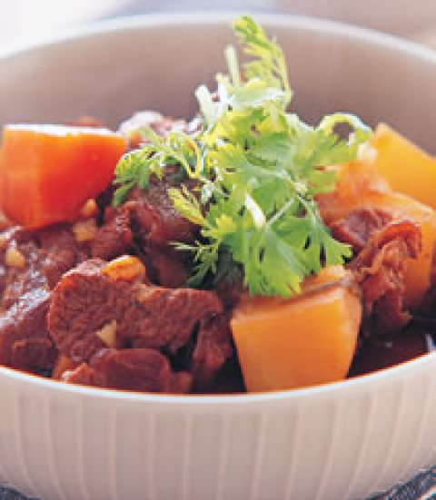 3.加入作法1的马铃薯块和胡萝卜块,续煮约30分钟至牛腱肉变软、汤汁略微收干即可。