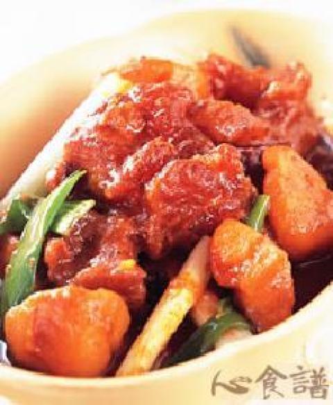3.热锅,辛香料a炒出油分后加入辛香料b炒香,与作法1、2的材料一起放入快锅内,并加入调味卤料,盖上锅盖煮沸后,改以中小火待笛响后续煮约25∼30分钟。