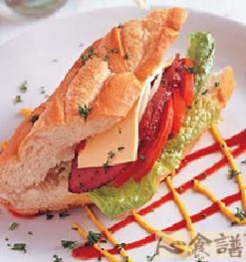法国面包1/3个,牛肉火腿片3片,烟燻起士片2片,生菜30g,蕃茄片2片,洋葱丝15g,奶油少许,蕃茄酱适量,芥末酱适量