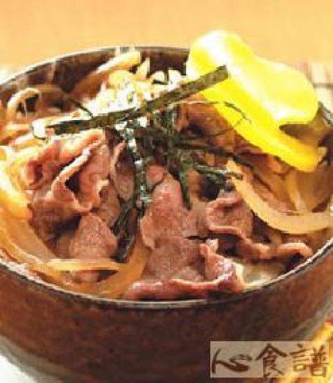 牛肉片90公克,姜40公克,洋葱60公克,腌萝卜20公克,白饭1碗,海苔丝适量,奶油5公克,味醂1大匙,酱油2茶匙,柴鱼汁50㏄