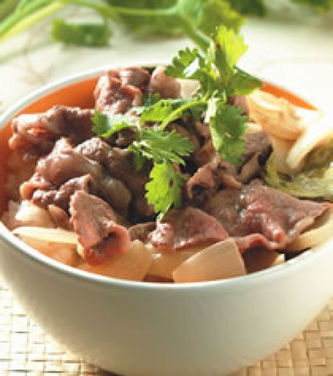 4.将牛肉片加入作法3的锅中拌开,煮约1分钟至牛肉变白、熟后即关火。