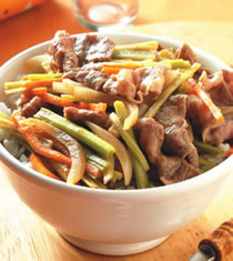 牛肉片90公克,洋葱30公克,胡萝卜15公克,芹菜40公克,白饭1碗,芝麻酱1大匙,麻油1大匙,高汤50㏄,酱油2茶匙,味醂1大匙