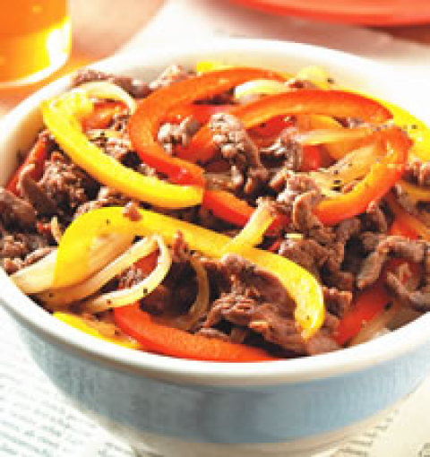 牛肉丝80公克,洋葱20公克,黄椒25公克,红椒25公克,白饭1碗,奶油5公克,黑胡椒1/2茶匙,柴鱼汁50㏄,酱油2茶匙,味醂1大匙