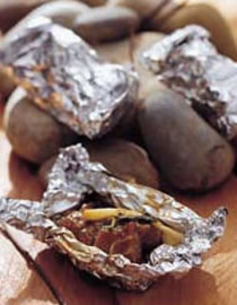 (3)每2块猪小排及少许葱段,用一张铝箔纸包密,全部做好备用。