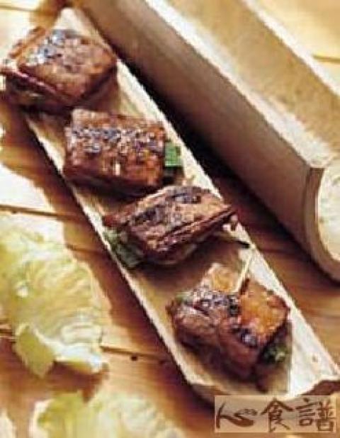 (2)每块豆干中夹入1片肉,及少许葱枝,用牙签固定,依序作好。并把调味料拌匀备用。