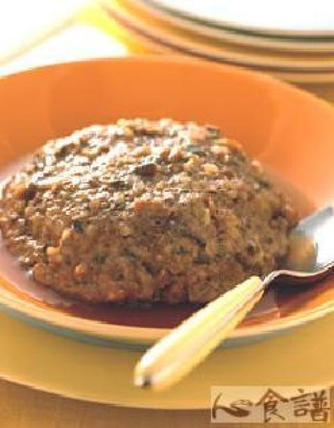 4.待作法3砂锅内水分烧干后转小火,开盖迅速舖上作法1的肉泥并稍微压成肉饼状。