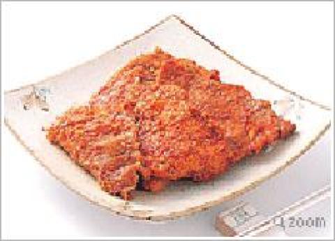 2.将韩式辣烤酱均匀抹于作法1的里肌肉片上,腌约10分钟至入味。
