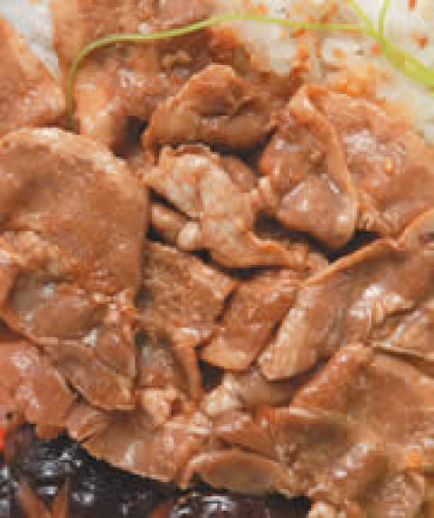 2.将猪肉片煎至双面皆上色,淋上作法1的酱汁,加入香菇煮至略收汁即可。