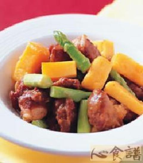 排骨600公克,芒果200公克,青芦笋80公克,蒜头10公克,地瓜粉3大匙,水2大匙,糖1/2大匙,盐1小匙,芒果汁1/2大匙,糖1/2大匙,盐1/2大匙,酱油1小匙,蒜末少许,芒果汁1/2大匙