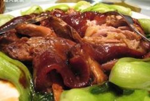 (3)猪蹄膀烧好,待完全冷却后,切薄片排盘即可。