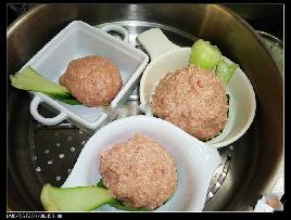 6.将外皮微煎的肉团上笼隔水蒸15.20分钟.