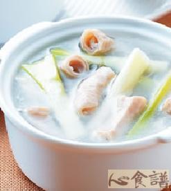 2.取葱白及葱根洗净,和猪脚、冰糖、盐及清水文火炖煮至熟烂。