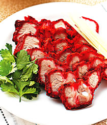 去皮五花肉400公克,蒜末1小匙,姜末1小匙,地瓜粉适量,鸡粉1小匙,砂糖1小匙,高梁酒2大匙,油桂粉1/2大匙,胡椒粉2小匙,香油2大匙,红色6号食用色素1/2包
