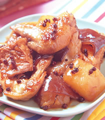 6.将作法1的鸡翅放入作法5锅中干煎至上色,再加入作法2的新鲜木耳、三角油豆腐和作法4的萝卜略微拌炒后,即可加入水、鲜美露和作法5的花椒粒,红烧至鸡翅熟透入味。