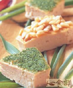 a.传统豆腐100公克,鸡绞肉300公克,胡麻油40㏄,砂糖13公克,鲜美露36㏄,蛋1颗,盐2公克,b.蛋黄1颗,鲜美露5㏄,c.烤过的松子适量,青海苔粉适量