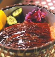 3.饭上先淋上适量鳗鱼酱汁拌匀后,放上作法2烤好的鳗鱼,撒上山椒粉,再摆上喜欢的配菜即可(以渍物为主)。