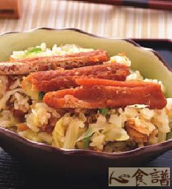 白米2杯,罐装红烧鳗2罐,高丽菜250公克,水2杯,盐1/4小匙,红葱油2大匙